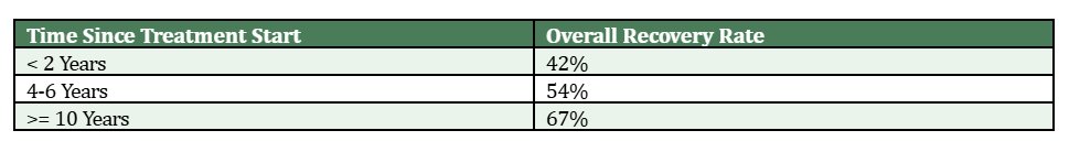 – Recovery climbs to 67% for those followed 10 years or longer